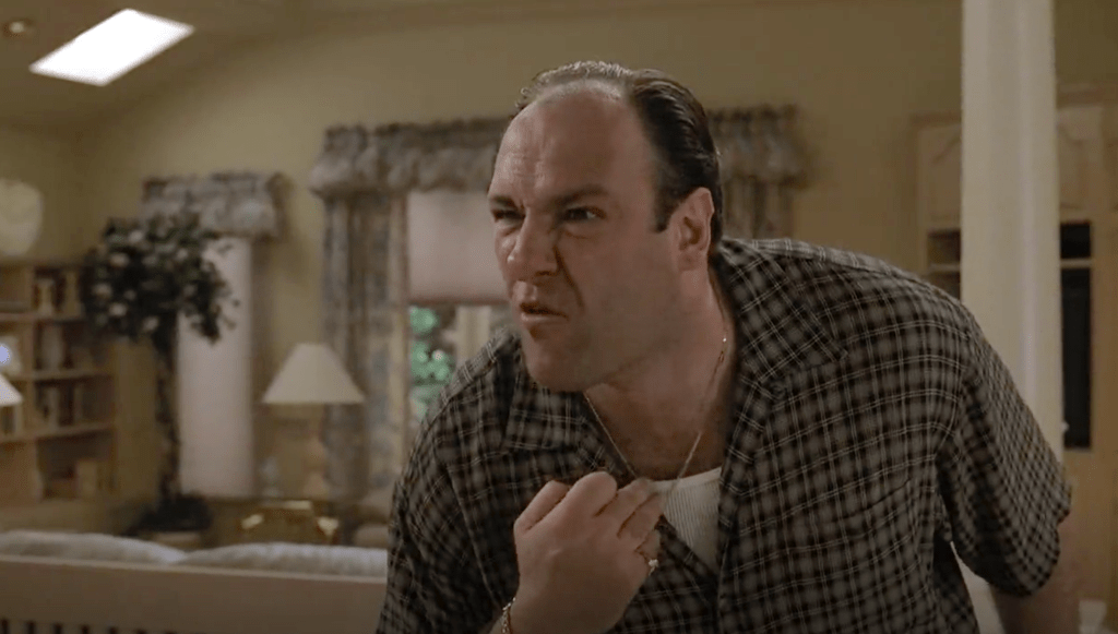 Tony: “Alright, on any fuckin’ scale you want to use, things are going good. I’m firmly in charge, no trouble there. My family’s healthy. So, why the fuck am i ripping phones out of the wall in front of my kid and screaming at my sister all the fuckin’ time, although, she is totally unimportant to me?”