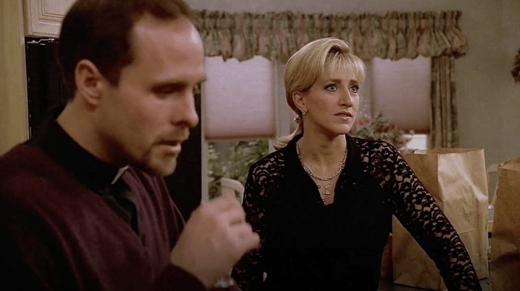 Floored and convicted, Father Phil leaves. In a textbook demonstration of narcissism, Carmela accuses Father Phil of exactly what she too is guilty of. Though her predicament is quite different, she too enjoys the “whiff of sexuality.” She craves the attention Father Phil readily gives, and that Tony does not. Raising the stakes, Carmela highlights how, while Father Phil allegedly wants to help Tony become a better person, he doesn’t hesitate to eat his food, drink his wine, or watch his television set. This directly correlates to Carmela’s own complicity, as underlined by her therapy session with Dr. Krakower in Season 3’s “Second Opinion.” Carmela is in luck, so long as someone else commits the same sins as her, as identifying and criticizing someone else’s culpability is an effective tactic for blocking out her own faults. Carmela’s entirely correct in her assessment of Father Phil, and it would be quite brave and heartwarming if it were intended as friendly, helpful advice. But, she’s a hypocrite, and her spite and jealousy of Father Phil “cheating” on Carmela with her best friend Rosalie (a freshly widowed woman!) exclusively inspire her harangue. Even with Jackie Aprile in the ground, Carmela and her narcissism have nothing better to do than to interrupt Rosalie and her flirtatious pasta feasts with Father Phil.